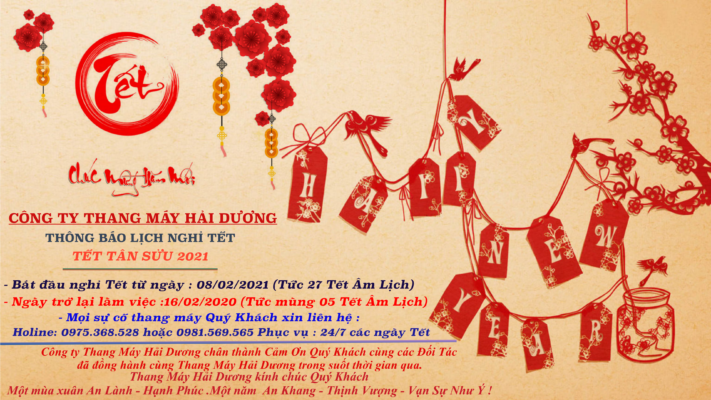 Công Ty TNHH Thang Máy Hải Dương trân trọng thông báo đến Quý khách hàng thời gian nghỉ Tết Nguyên đán 2021 như sau:
